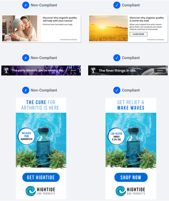 Cannot claim health benefits: Ads cannot use language that suggests a cure for any ailments, medical conditions or diseases. Messaging around CBD should be a little more vague, such as “get relief”, “find relaxation”, or “rest easy.”