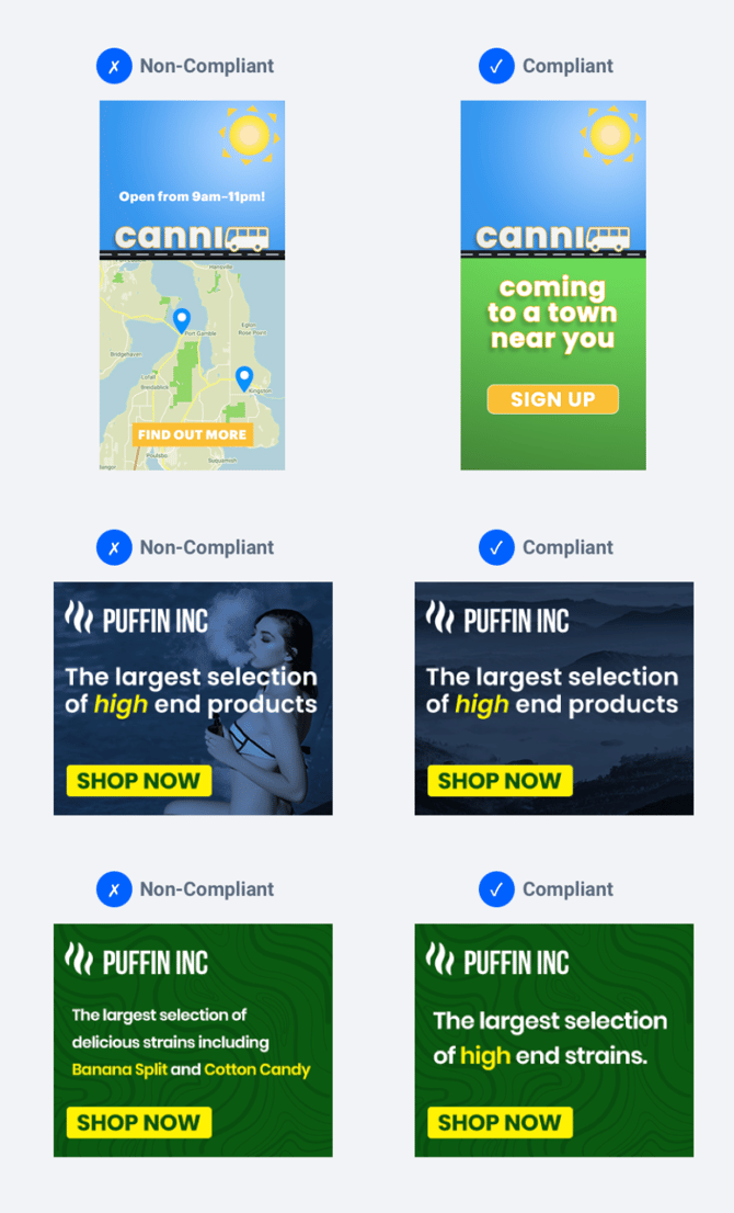 Cannot have price, location, and distribution: Ads cannot specify price, address, or hours of operation. However, for approved U.S. advertisers, you can include the business address on the creative—as long as all required cannabis disclaimers are present.
