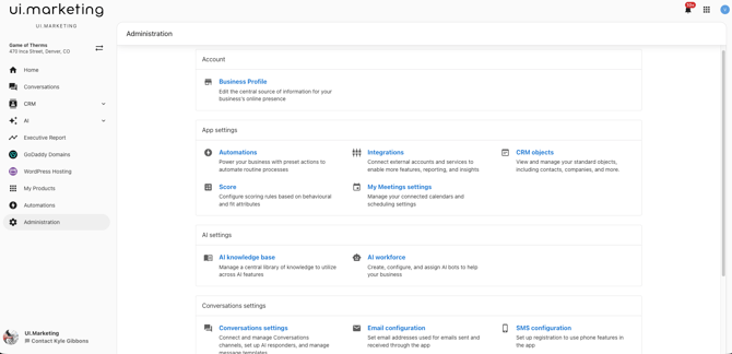 Learn more about the Administration section of your Ui.Marketing Business App for Conversations AI