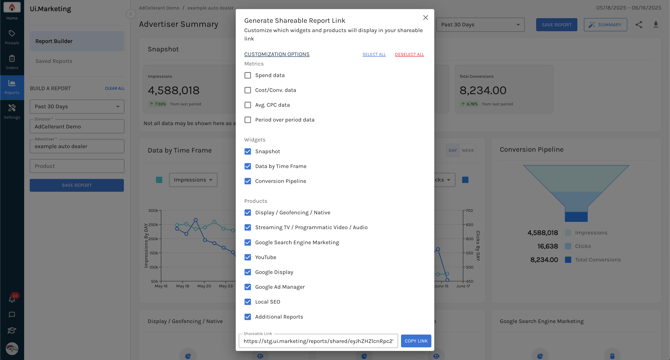 From the advertiser summary page, users can share a link and customize which products, widgets, and spend metrics they want to share. To include items in a report, the checkbox must be checked. Any unchecked boxes will not be included.
