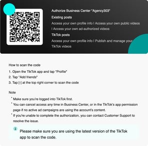 To grant access to your TikTok Profile, scan the QR code provided using the TikTok app while logged into your account.