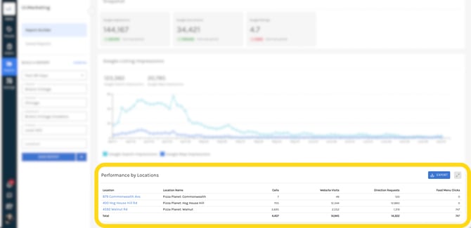 The Performance by Locations table lets users view key Local SEO metrics by location and compare individual performance by location.