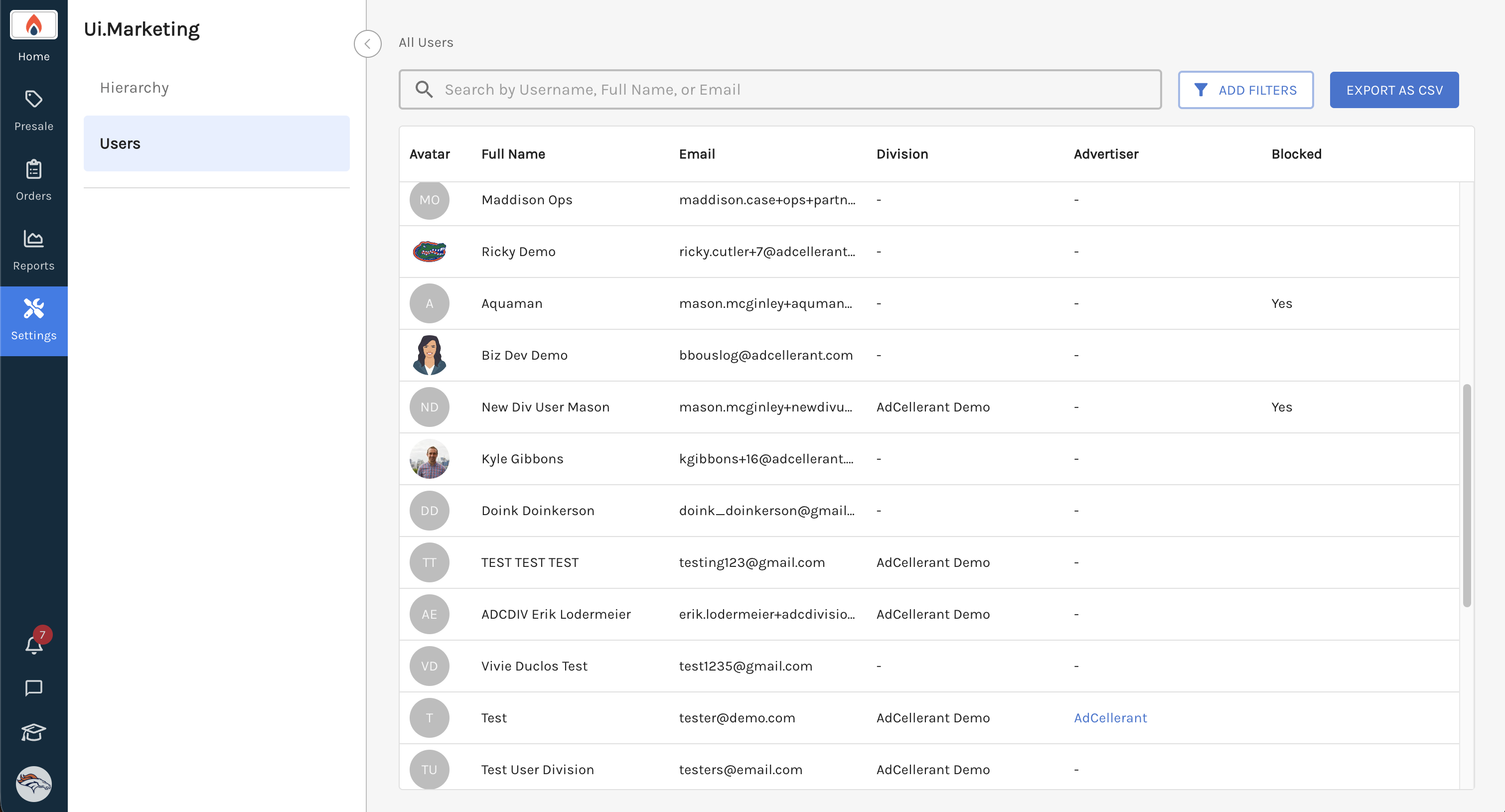 Ops-level users in Ui.Marketing are able to view all users under their partner, division, and even advertiser-specific users.