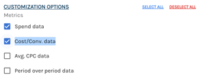 Hide spend metrics for Google SEM and Performance Max reporting. Spend metrics will automatically be turned off (unchecked) when sharing or creating a PDF report. Learn more >
