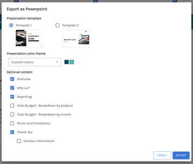 Customize how you export your proposals! With this feature, you can export your proposal into a PDF, PowerPoint, and a CSV. You can also pick and choose the template and which slides you want to export, as well as change the colors. Plus, easily include our new slides for terms and conditions and total budget breakdowns. Learn more >